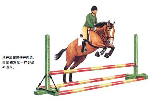 這是跑步跨越單地桿和圓圈跑步跨越地桿訓(xùn)練的提升,障礙只需要45cm高,并在兩側(cè)各放一根地桿,距離與障礙的高度相同。這樣的障礙馬匹很容易也很愿意跳越。
