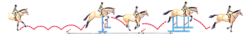 騎手應用一個平衡、有節(jié)奏的快步前進接近障礙,保持兩腿緊貼于馬的肋側(cè),但允許馬去跳越。騎手必須讓馬匹在他的控制下跳越,但也不能因上身過早或過度的前傾給馬的肩部增加壓力。當騎手騎馬離開復合障礙時,要確保立即恢復節(jié)奏。