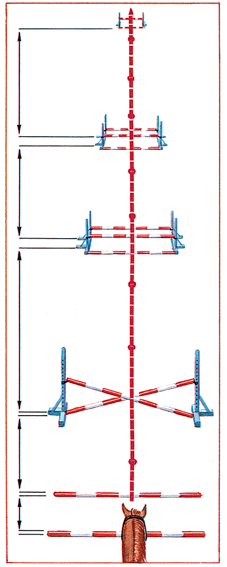 這是前一個復(fù)合障礙的另一變化形式,在距交叉桿2.1-2.7米處放置兩個快步桿(間距1.2-1.5米),在距交叉桿4.5-5.4米處放置第一個平行欄,然后在距此欄4.8-5.7米遠處放置第二個平行欄,再在距此欄7.2-9.0米遠處放置一個垂直欄。這是讓馬伸展跳越兩個平行欄,然后用一個短步跳越垂直欄測試馬的技術(shù)。在所有障礙欄(除交叉桿)前都有一個地桿,垂直欄的地桿距垂直欄60厘米。