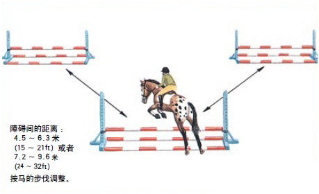 練習(xí)斜角跳越的一個(gè)好的方法是用3個(gè)障礙擺成一個(gè)三角形,每個(gè)障礙之間相隔一或兩大步,具體根據(jù)障礙的大小而定,障礙小距離就短。一大步的距離約為4.5-6.3米,兩大步的距離約為7.2-9.6米。根據(jù)向一側(cè)還是兩側(cè)跳越,距離可調(diào)整為是長(zhǎng)還是短。如果你跳越小的障礙,要調(diào)整距離適合你的馬匹。從跑步跳越時(shí),要調(diào)整適合跑步的距離。