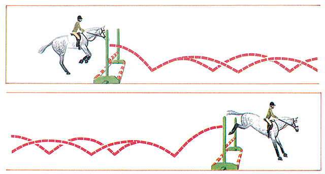 馬或矮馬都必須隨時變換步態(tài),確保不喪失節(jié)奏。任何時候喪失節(jié)奏都表明缺乏推進力和平衡。在平地所做的一切訓(xùn)練都應(yīng)有助于馬匹能伸長或縮短它的步幅,同時又不喪失節(jié)奏或平衡。這種兩個障礙的平地跳越就證明了這一點,并且應(yīng)從兩個方向跳越。
