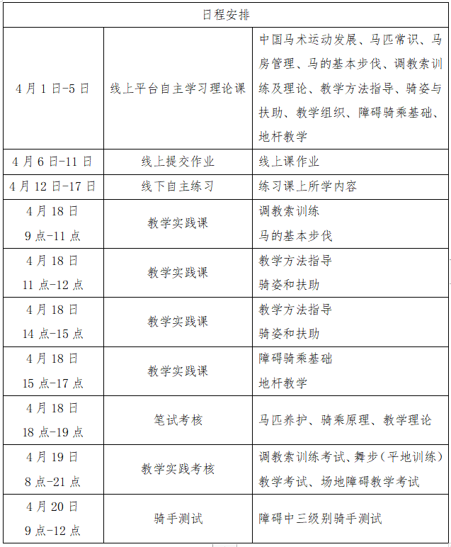 線下輔導(dǎo)和實(shí)踐考核:2022年4月18日-20日,在北京騎緣國(guó)際馬術(shù)俱樂(lè)部進(jìn)行線下集中輔導(dǎo)與實(shí)踐考核。