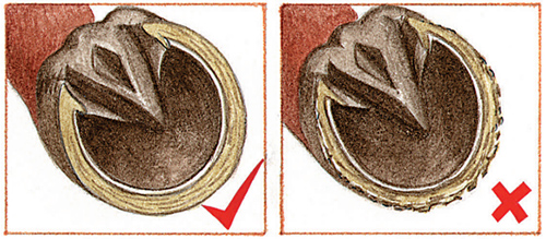 蹄鐵的合適程度要看它是否對(duì)馬的蹄踵提供一個(gè)大的支撐面。馬蹄應(yīng)該處于最佳狀態(tài)。如果由于蹄角質(zhì)弱或松軟易損,蹄鐵裝釘不牢固,那么在期望馬應(yīng)對(duì)耐力騎乘的額外訓(xùn)練前,要注意在飼料中添加利于馬蹄角質(zhì)生長(zhǎng)的添加劑。