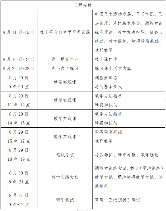 (三)線下輔導和實踐考核:2022年8月29日-31日,在廣東省東莞市金伯樂馬術學府進行線下集中輔導與實踐考核。