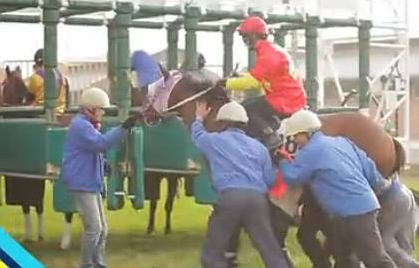 人工協(xié)助馬匹入閘有很多方法,需要根據(jù)馬匹的性格來選擇適當(dāng)?shù)姆绞?,比如有的馬喜歡被捏耳朵,這樣比較容易放松;有的馬需要蒙住眼睛,由牽引員帶領(lǐng)入閘;有的馬則需要兩人站在其身體兩側(cè),將其推入閘廂。