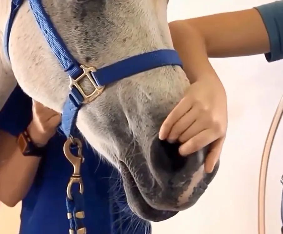 (1)讓助手在馬的左側(cè)牽拉馬,同時(shí)保持馬頭在正常高度。自身在同側(cè)上前輕撫馬的鼻孔內(nèi)側(cè)。