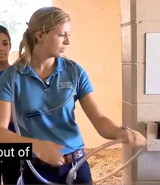 (4)當(dāng)?shù)竭_(dá)第二處標(biāo)示時(shí),在導(dǎo)管起始端吸氣。檢測(cè)是否為負(fù)壓,也可以嗅聞導(dǎo)管中 是否傳來苜蓿草或飼料氣味,這些跡象表明導(dǎo)管進(jìn)入了胃部。右手時(shí)刻緊扣,防止導(dǎo)管滑動(dòng)。也可以用膠布等固定導(dǎo)管。