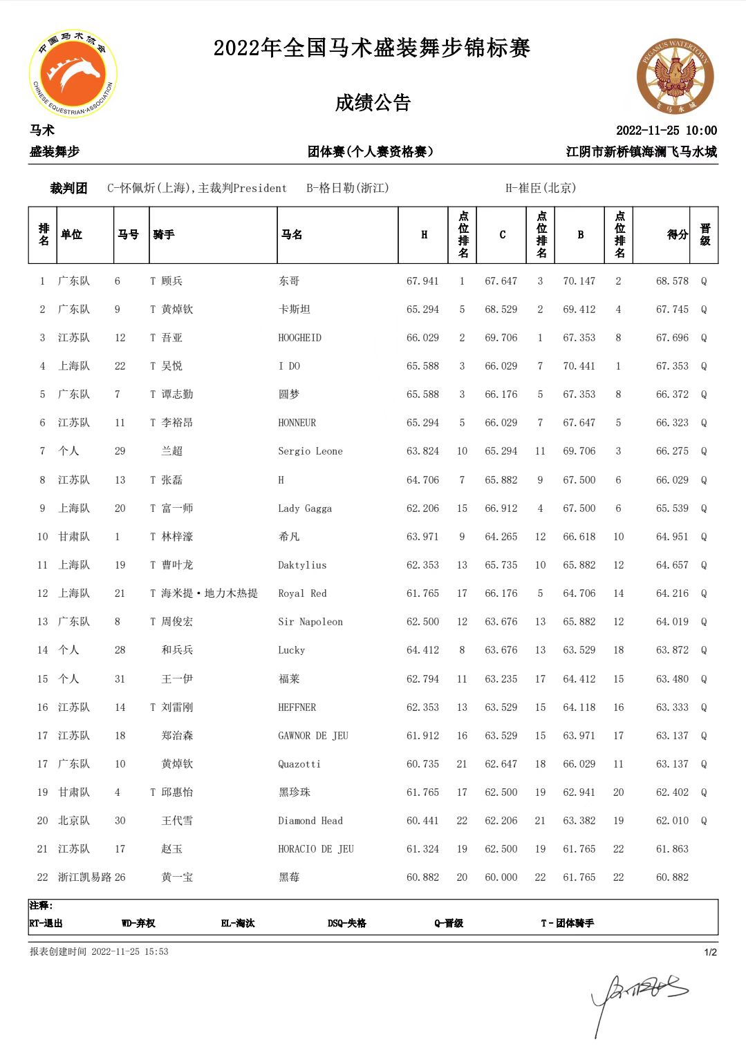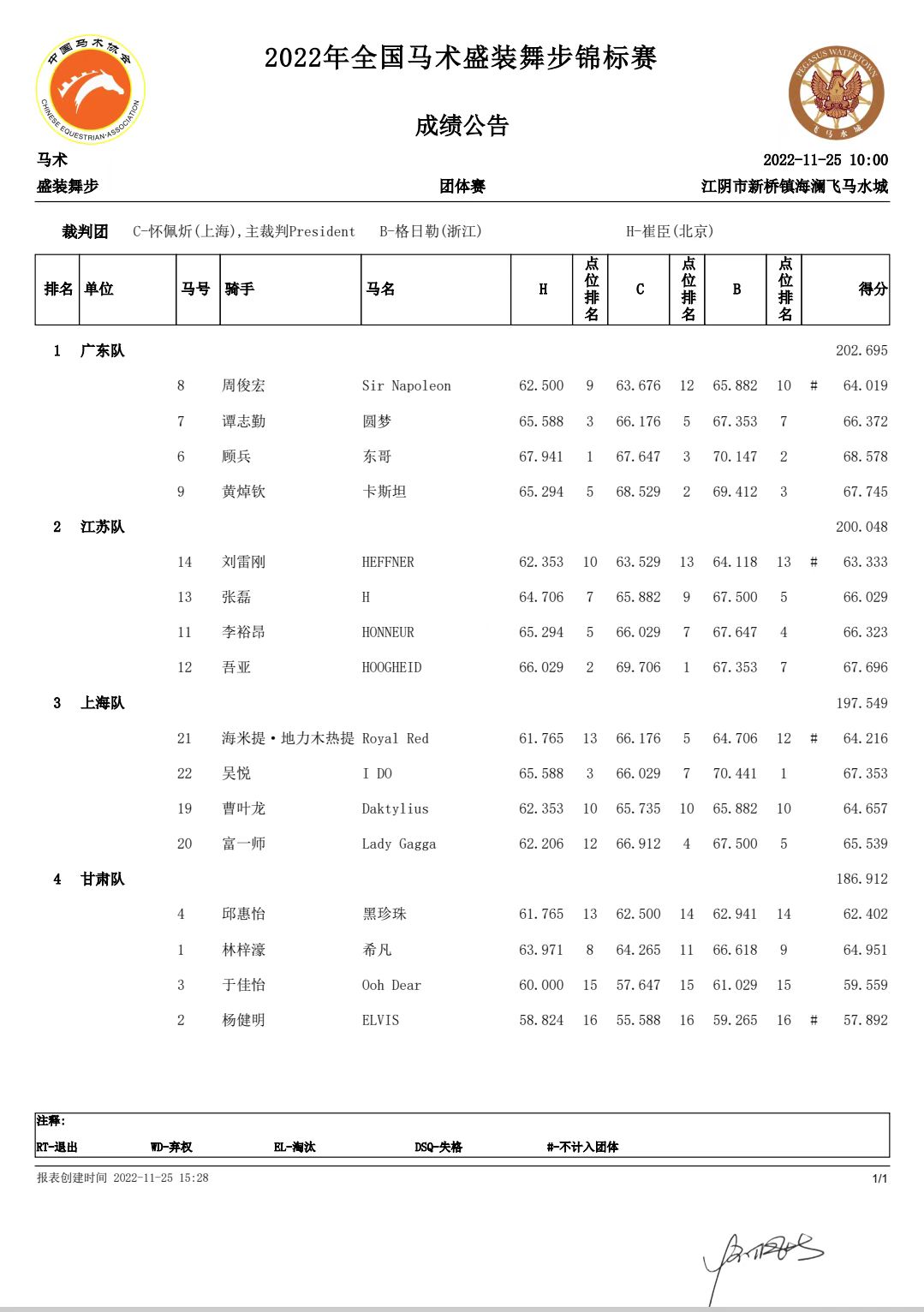 2022年全國(guó)馬術(shù)盛裝舞步錦標(biāo)賽團(tuán)體賽及個(gè)人資格賽名次揭曉