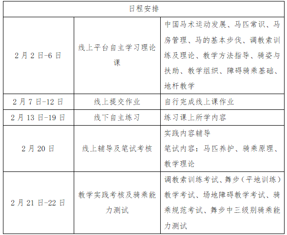 馬術(shù)一星級(jí)專業(yè)教練培訓(xùn)考核將于2023年2月2日-22日在線上開(kāi)班。本次活動(dòng)以線上方式進(jìn)行培訓(xùn)與考核,中外專家聯(lián)合授課??己撕细裾邔⒈皇谟柚袊?guó)馬術(shù)一星級(jí)專業(yè)教練員能力水平證書,并可進(jìn)一步申報(bào)全國(guó)初級(jí)教練員崗位班,經(jīng)考試合格后獲取初級(jí)職稱。