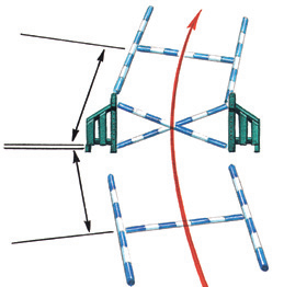 在拐彎處,擺一個交叉桿,在交叉桿的前后各放一個地桿,這樣的練習(xí)可以改進(jìn)馬匹以正確的腿著地。(如下圖)