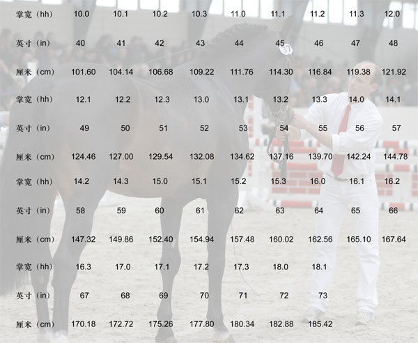 在英國、美國、加拿大,愛馬、養(yǎng)馬、賽馬、騎馬是一個傳統(tǒng)。在過去,養(yǎng)馬人沒有體尺,如何測量馬的體高呢?他們發(fā)明了用手掌,即用手掌的寬度從地上沿著馬的前腿到馬的鬐甲,測量的時候用兩手交替地測量和數(shù)數(shù),數(shù)到多少個就是多少“掌”。