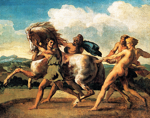 《奴隸與馬的較量》的創(chuàng)作靈感,來源于席里柯1816年之后的生活經(jīng)歷。那一年,拿破侖在法國發(fā)動的戰(zhàn)爭宣告失敗,面對處于戰(zhàn)亂中的故鄉(xiāng),席里柯選擇了離開,并在意大利羅馬定居。在羅馬,他領(lǐng)略到了異國風(fēng)情的魅力,也平生第一次觀賞到羅馬狂歡節(jié)中著名的表演項目“裸馬賽會”(指沒有騎手參與的賽馬活動)。壯觀的表演場面再次激發(fā)他創(chuàng)作了一系列以“表現(xiàn)人類同馬之間力量與控制”為主題的畫作,這幅作品就是當(dāng)時具有代表性的主題創(chuàng)作。畫作于1817年面世,它直觀清晰地表達了歐洲原始部落的奴隸掌控馬匹的方式,還借助富有張力的躍馬動作和奴隸們生動的造型,間接地使讀者身臨其境地感受到畫家在創(chuàng)作畫作時的動蕩不安、沉郁苦悶的內(nèi)心世界。(馬術(shù)雜志)