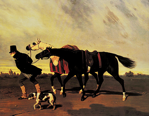 《賽馬歸來》這幅作品創(chuàng)作于1840年,德-德勒用幽默的繪畫語言描述了這個有趣的場景:一個男人正牽著兩匹賽馬剛從賽場往家里趕去?;丶衣飞希L陣陣,男人用圍巾把嘴捂得嚴嚴實實。對于男人和他的賽馬來說,這肯定是難言成功的一天,就連陪他們一起回家的小狗身上也透露著濃濃的失望氣息。整幅作品筆調風趣,色彩活潑,體現(xiàn)出作者對當時社會細節(jié)的準確捕捉以及對賽馬運動的獨特趣味。(馬術雜志)