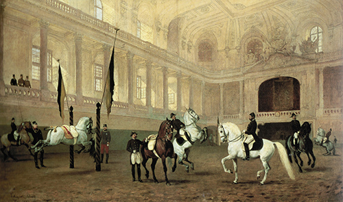 西班牙馬術(shù)學校的訓練馬只使用利比扎馬,這是一種兼有西班牙、那不勒斯和阿拉伯血統(tǒng)的馬,早先來自利比亞。它們出生時是淺黑色,大約長到7歲時才具有這種耀眼的白色。每天奧地利騎士們都會同它們一起訓練。在這張畫的中間是王子埃默里希·馮·圖恩和塔克西斯,而旁邊的騎士正在訓練馬跳越障礙。(馬術(shù)雜志)