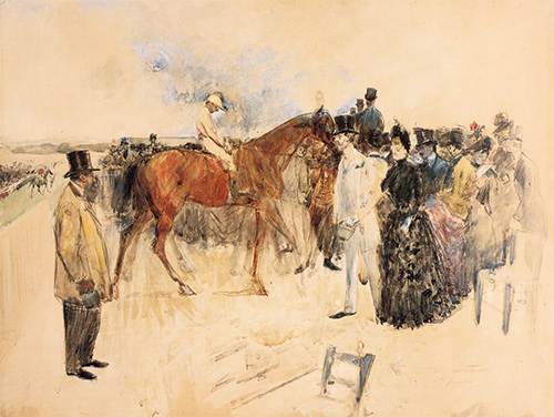 這幅《多維爾賽馬》以法國著名的賽馬場為創(chuàng)作背景,透過熙熙攘攘的人群,我們會不由得聯(lián)想到法國興盛的馬業(yè),觀看賽馬甚至成為法國上流社會的達官顯貴互通有無的一個重要契機。畫中還為我們呈現(xiàn)了容色妍麗的女士們,身著為賽事精心定制的禮帽及時裝同男賓一同出席賽馬活動,這種引領法國時尚潮流的穿戴恰恰證明了法國人與生俱來的浪漫情致和對賽馬文化的熱愛。(馬術雜志)
