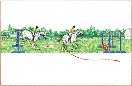 騎手必須了解,行進路線一般都帶有弧度,而不是一條直線。如果想要采取一條距離稍長的路線并且同時獲得良好的起跳時機,那么騎手需要增加一次跑步;如果想走較短的路線,那么需要減少一次跑步。通常騎手容易犯的錯誤是,當(dāng)他們選擇以直線奔向下一道障礙的時候,容易導(dǎo)致起跳點過近,所以必須小心!由此可見,準(zhǔn)備一套應(yīng)急方案尤為重要:如果在行進的過程當(dāng)中,騎手感覺到馬匹狀態(tài)不佳、無法克服障礙,那么最好改變原計劃,采取一條稍長而穩(wěn)妥的路線,這樣可以為馬匹日后的比賽奠定信心。