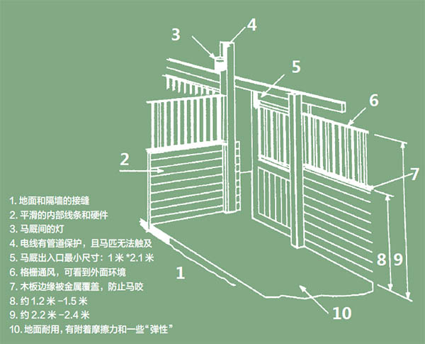 馬廄是馬房或庇護(hù)處的基本功能單元。在進(jìn)行馬廄設(shè)計(jì)時(shí),工作人員和馬匹的安全是應(yīng)主要考慮的因素。日常工作的便利與好的馬匹護(hù)理息息相關(guān)。不管是什么樣的管理風(fēng)格或需求,安全的馬廄都具備同樣的基本元素。馬廄特點(diǎn)有很多選擇,不同的選擇關(guān)系到功能和費(fèi)用支出。