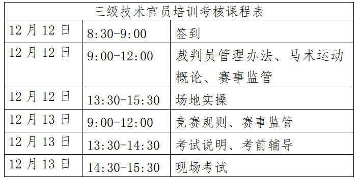 根據(jù)馬術(shù)專(zhuān)業(yè)人才培養(yǎng)計(jì)劃,我協(xié)會(huì)將與南昌市體育局于2023年12月12日-13日在江西南昌一朵青云馬術(shù)運(yùn)動(dòng)中心舉辦馬術(shù)場(chǎng)地障礙三級(jí)技術(shù)官員培訓(xùn)考核活動(dòng),合格者授予中國(guó)馬術(shù)協(xié)會(huì)相應(yīng)等級(jí)技術(shù)官員證?,F(xiàn)就本次培訓(xùn)考核相關(guān)事宜通知如下: