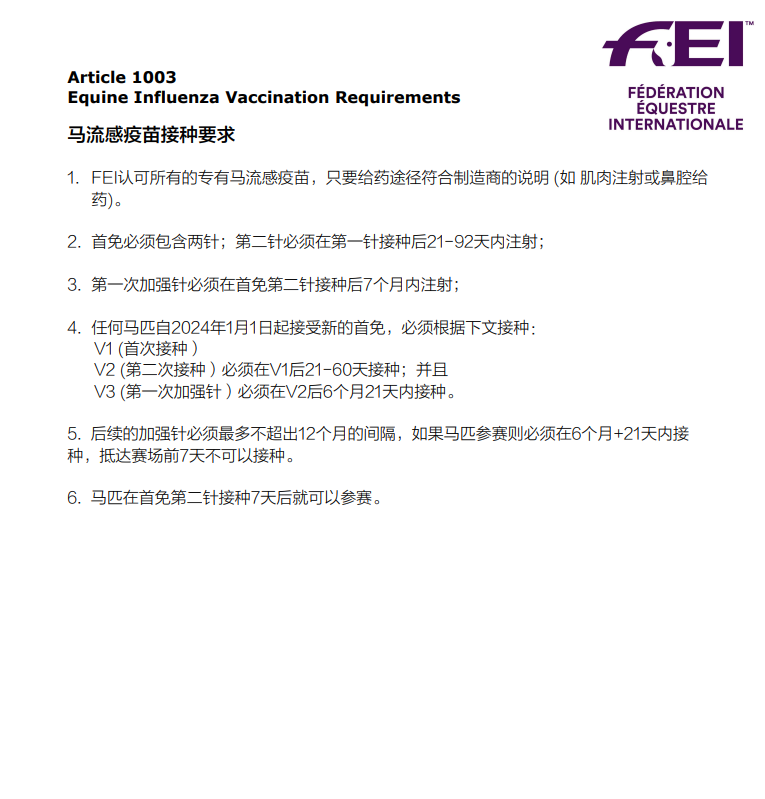各參賽運(yùn)動(dòng)隊(duì)于2024年1月25日?qǐng)?bào)到,報(bào)道的同時(shí)提交馬匹護(hù)照和馬匹檢疫證明,未提交相關(guān)證明的馬匹不得進(jìn)入馬廄。參賽馬匹均須按國(guó)際馬聯(lián)相關(guān)規(guī)定注射流感疫苗,并在護(hù)照進(jìn)行詳細(xì)記錄,無(wú)疫苗或疫苗不符合國(guó)際馬聯(lián)要求的馬匹,組委會(huì)有權(quán)拒絕其參賽。