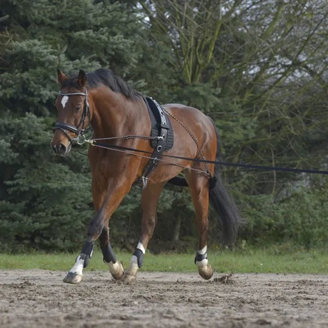 馬匹保持伸展?fàn)顟B(tài)能夠讓其自然并且放松地使用所有關(guān)節(jié),騎手應(yīng)當(dāng)鼓勵馬匹充分地伸展它的脖子,從背部一直延伸至鼻子,直到下方地面,自然地去加強(qiáng)腹部、腰部以及背部的肌肉力量。也可以使用調(diào)教沙邦來輔助馬匹伸展,對于那些無法通過背腹部力量進(jìn)行加強(qiáng)的肌肉(如脖子以下的肌肉),將會有很大的幫助。