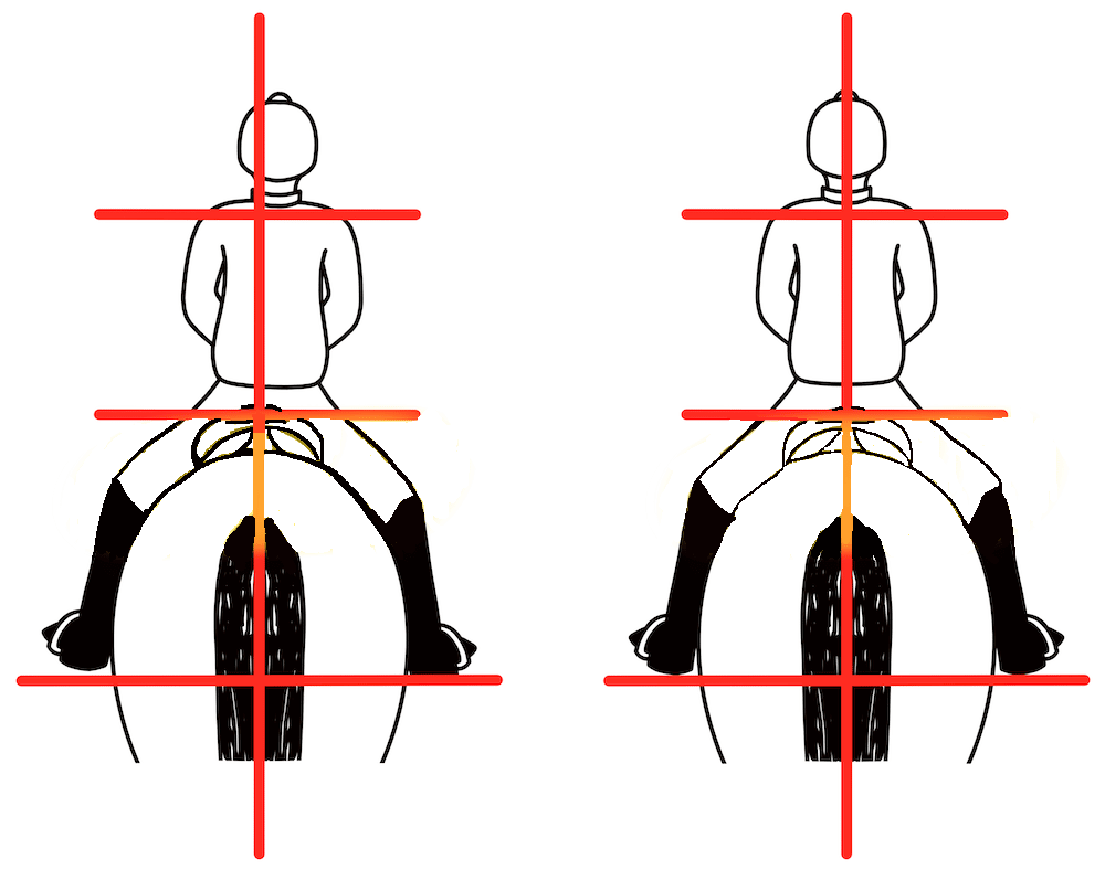 (如圖)你有點(diǎn)稍微偏右坐,那你的右側(cè)坐骨將承擔(dān)更多重量。使用騎坐來(lái)影響馬之前,你必須先擁有完美平衡的騎坐。