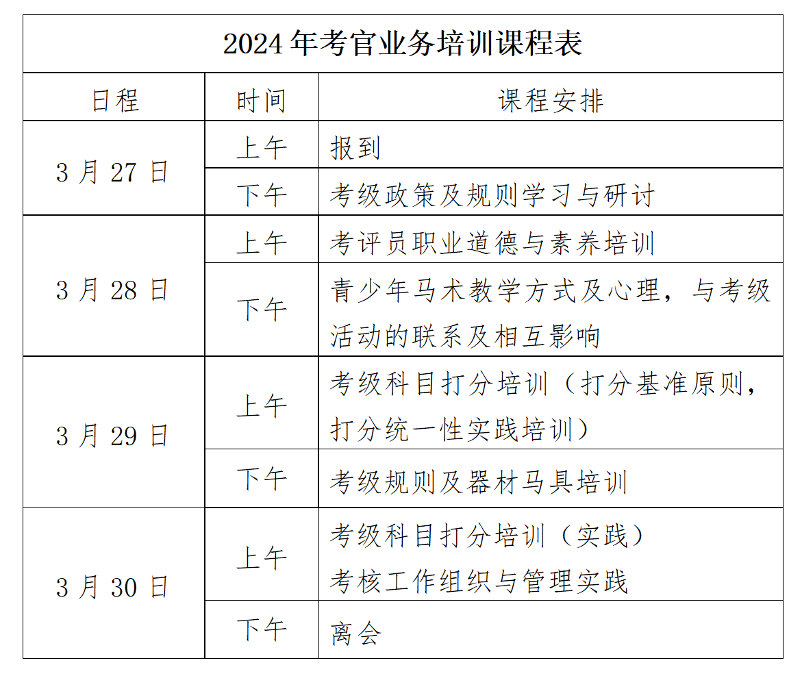 我協(xié)會將于2024年3月27日到30日在上海市愛久馬術(shù)俱樂部舉辦考官業(yè)務培訓活動。現(xiàn)就本次培訓考核相關(guān)事宜通知如下: