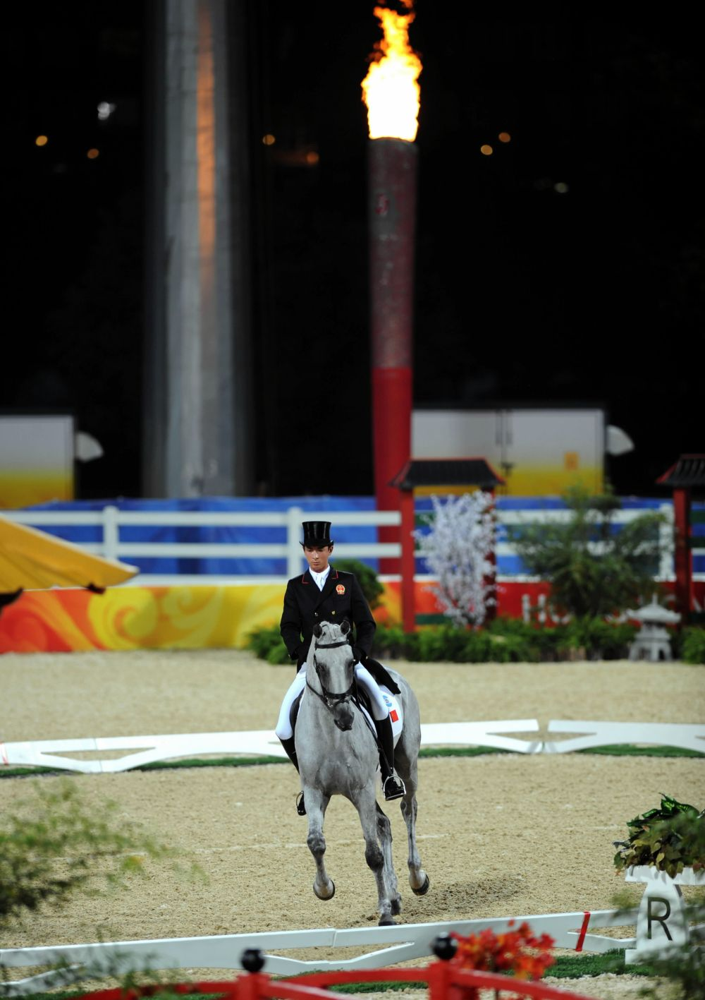 2008年8月9日,中國騎手華天在比賽中。當日,中國騎手華天在香港參加北京奧運會馬術比賽三項賽盛裝舞步賽,這是中國運動員首次亮相奧運馬術比賽場。新華社記者 盧炳輝 攝