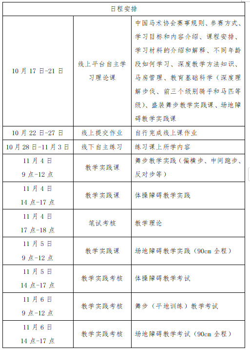 (三)線下輔導(dǎo)和實踐考核:2024年11月4日-6日,在西部巨人馬術(shù)俱樂部進行線下集中輔導(dǎo)與實踐考核。