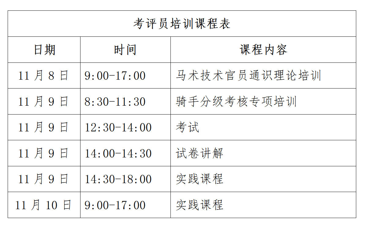 為進一步推進考評員人才隊伍建設,我協(xié)會將于2024年11月8日-10日在湖北省武漢市國家馬術學院(武漢商學院體育學院·國際馬術學院)舉辦考評員培訓活動,合格者授予相應等級考評員證書?,F就本次培訓考核相關事宜通知如下: