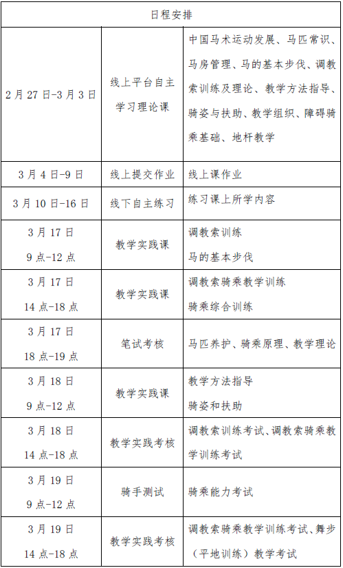 (三)線下輔導(dǎo)和實(shí)踐考核:2025年3月17日-19日,在捷通競(jìng)技馬術(shù)俱樂(lè)部進(jìn)行線下集中輔導(dǎo)與實(shí)踐考核。