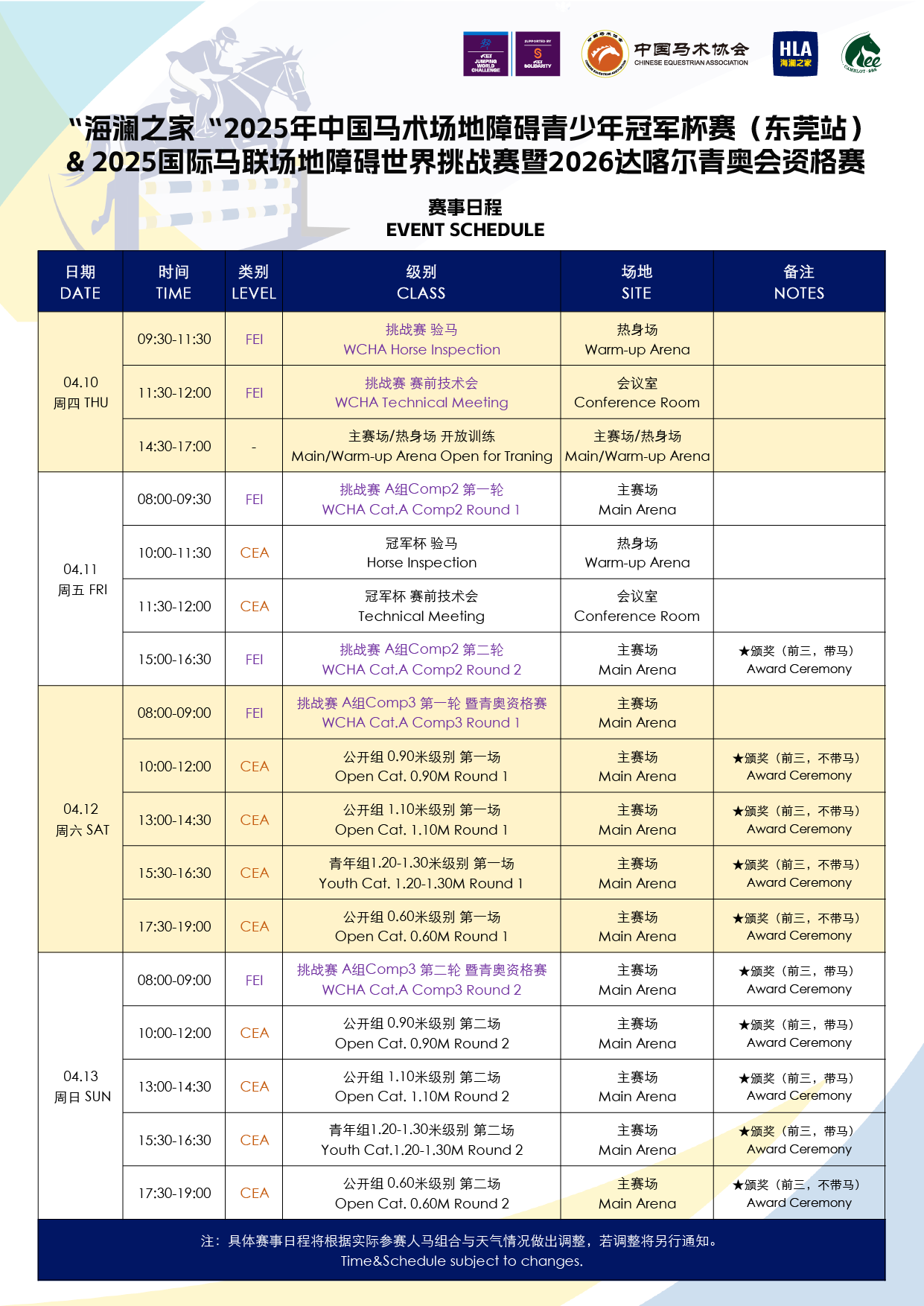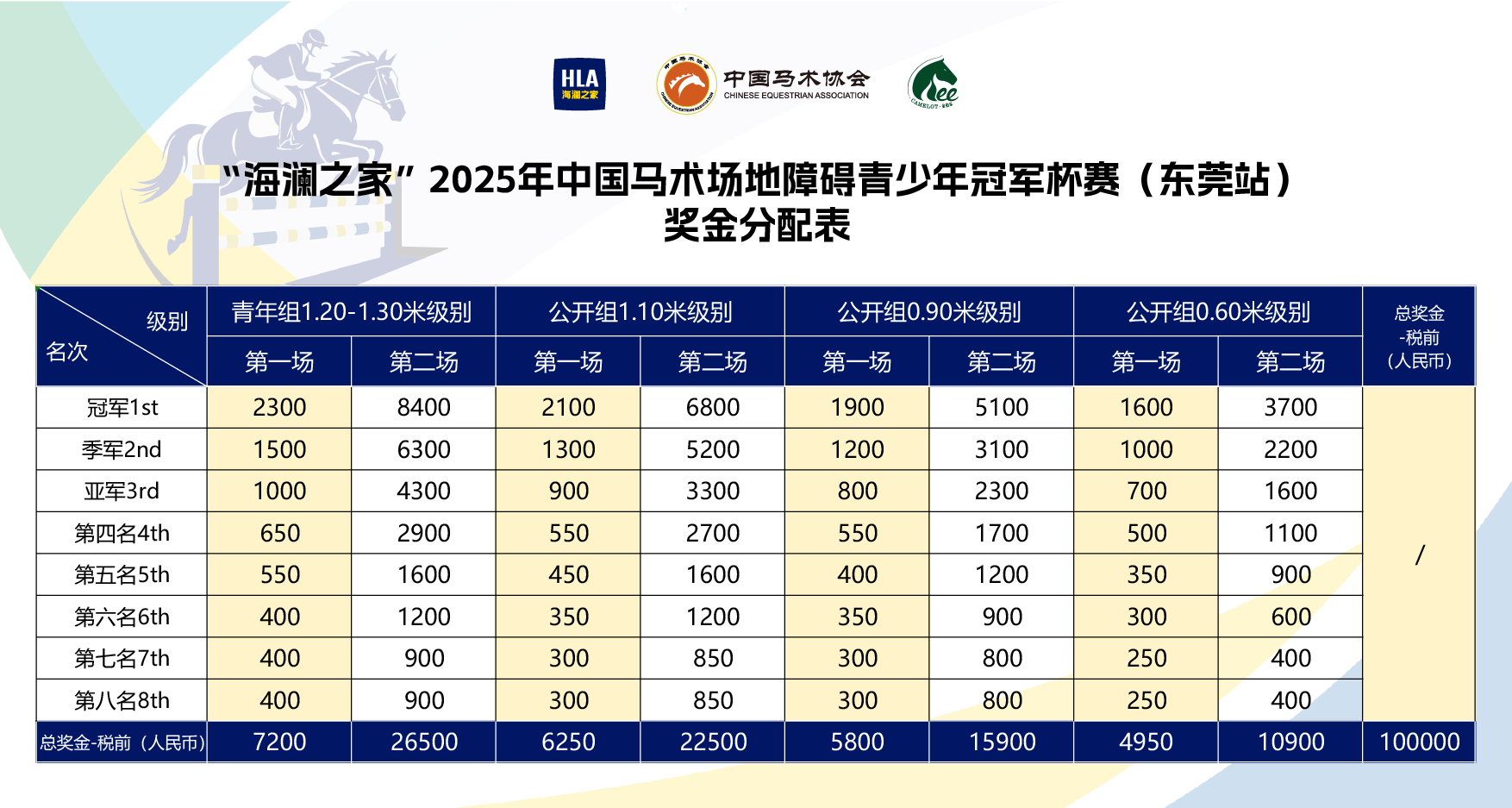 “海瀾之家”2025年中國(guó)馬術(shù)場(chǎng)地障礙青少年冠軍杯賽(東莞站)將于2025年4月10日(周四)—13日(周日)在廣東省東莞市金伯樂(lè)馬術(shù)學(xué)府舉辦。為使比賽順利進(jìn)行,現(xiàn)將賽事有關(guān)事宜通知如下: