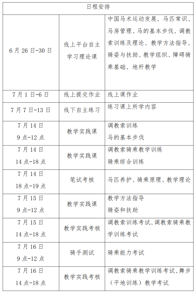 (三)線下輔導(dǎo)和實踐考核:2025年7月14日-16日,在大連騏跡馬術(shù)俱樂部進(jìn)行線下集中輔導(dǎo)與實踐考核。