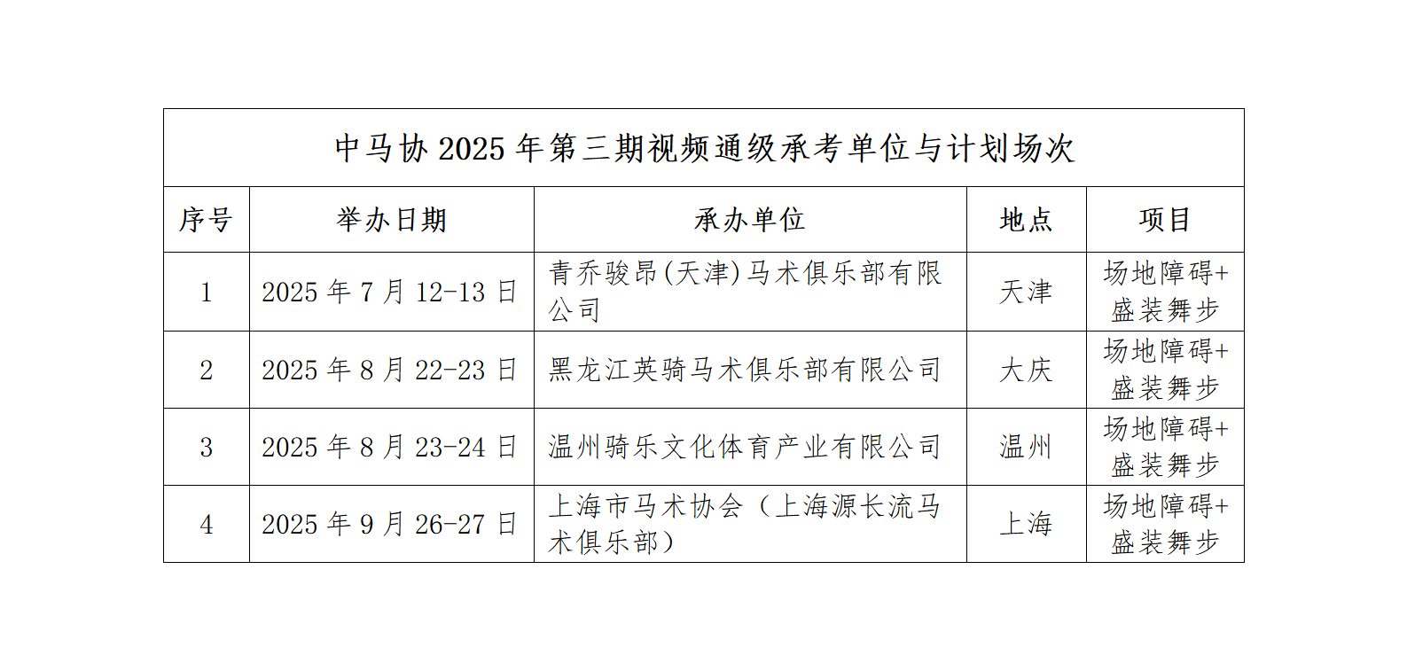 (五)在本期所有承考單位考核視頻拍攝上報(bào)完成后,中國(guó)馬術(shù)協(xié)會(huì)組織考官評(píng)審打分,通過(guò)考核的等級(jí)名單將在官網(wǎng)公示。