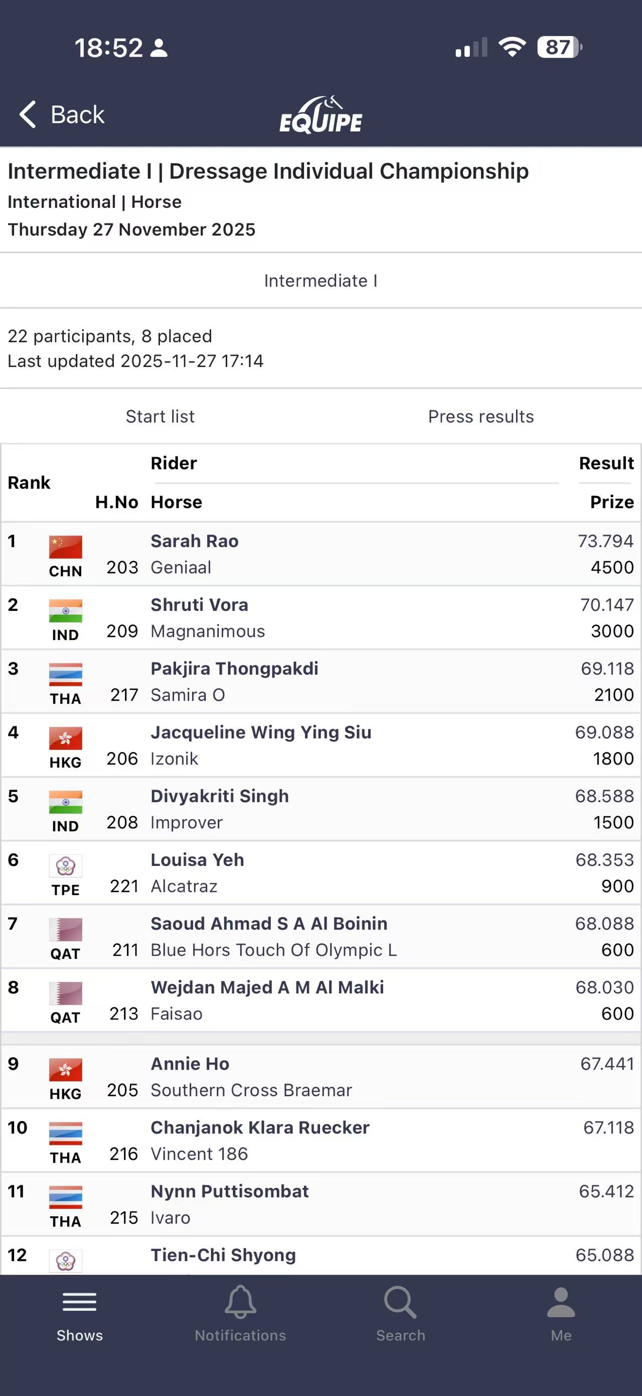 本屆亞錦賽盛裝舞步項(xiàng)目共有來自中國(guó)、中國(guó)香港、中國(guó)臺(tái)北、印度、泰國(guó)、卡塔爾、巴林、阿聯(lián)酋共8個(gè)國(guó)家和地區(qū)的22對(duì)人馬組合參賽,其中包括中國(guó)年僅18歲的年輕騎手劉驊之,她也在本屆賽事中完成了個(gè)人亞錦賽首秀。