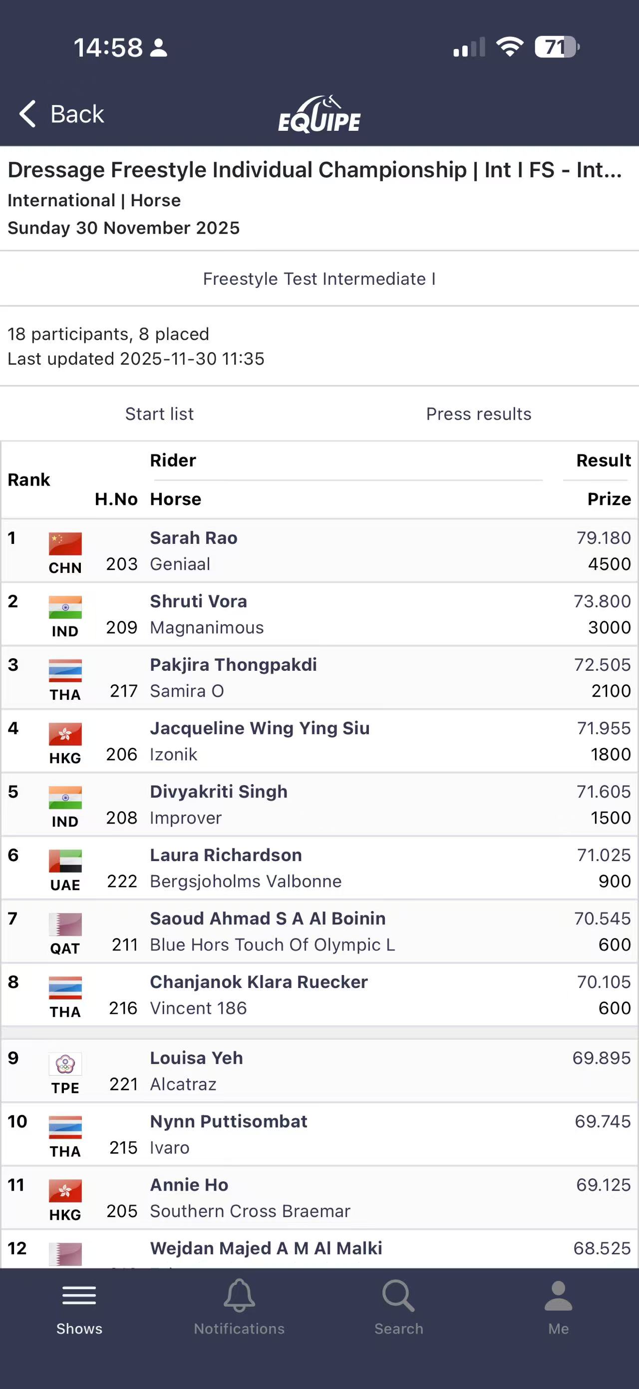 本場(chǎng)比賽共有18對(duì)人馬參賽,來(lái)自中國(guó)、中國(guó)香港、中國(guó)臺(tái)北、印度、泰國(guó)、巴林、卡塔爾、阿聯(lián)酋等國(guó)家和地區(qū)。印度選手Shruti Vora 獲得第二名,泰國(guó)選手 Pakjira Thongpakdi 獲得第三名。