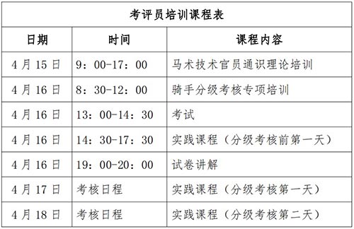 根據(jù)考評員培訓(xùn)計(jì)劃,我協(xié)會將于2021年4月15日-18日在南京金陵馬匯國際馬術(shù)俱樂部舉辦考評員培訓(xùn)活動,合格者授予相應(yīng)等級考評員證書?,F(xiàn)就本次培訓(xùn)考核相關(guān)事宜通知如下: