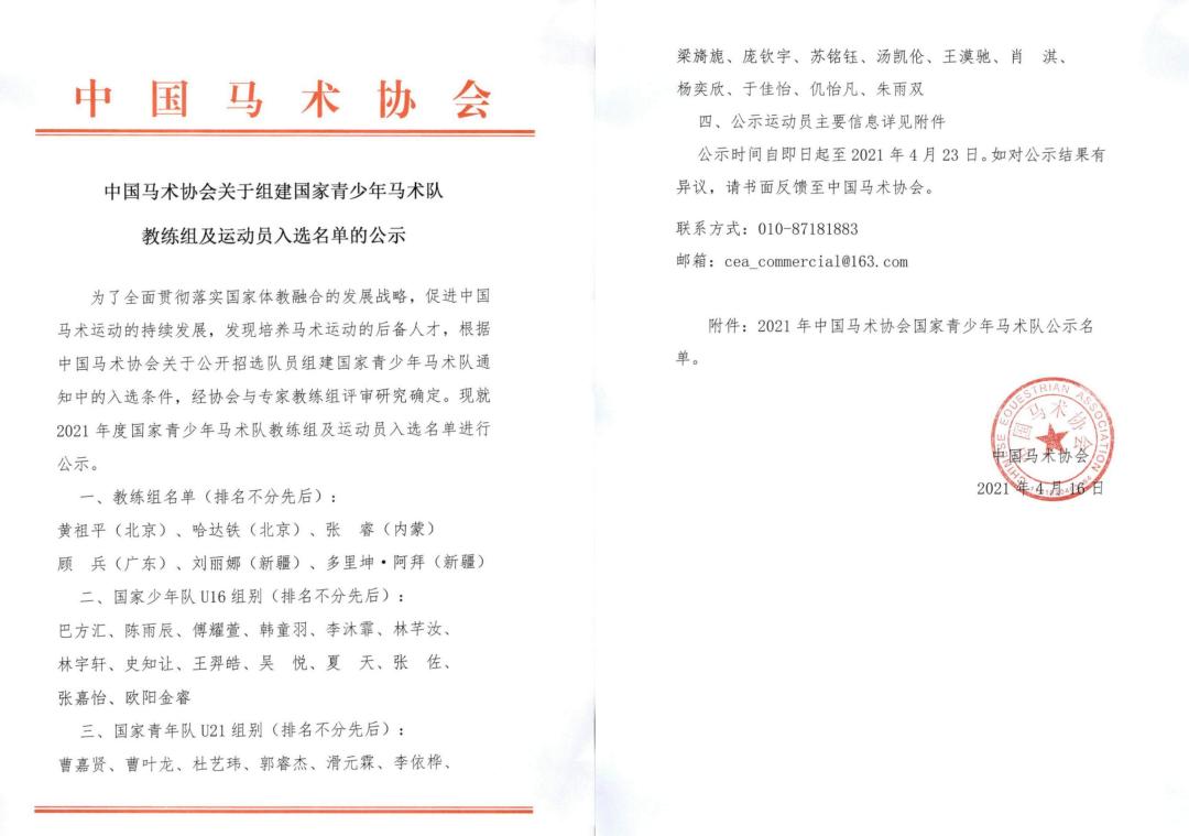 為了全面貫徹落實(shí)國家體教融合的發(fā)展戰(zhàn)略,促進(jìn)中國馬術(shù)運(yùn)動(dòng)的持續(xù)發(fā)展,發(fā)現(xiàn)培養(yǎng)馬術(shù)運(yùn)動(dòng)的后備人才,根據(jù)中國馬術(shù)協(xié)會(huì)關(guān)于公開招選隊(duì)員組建國家青少年馬術(shù)隊(duì)通知中的入選條件,經(jīng)協(xié)會(huì)與專家教練組評(píng)審研究確定?,F(xiàn)就2021年度國家青少年馬術(shù)隊(duì)教練組及運(yùn)動(dòng)員入選名單進(jìn)行公示。