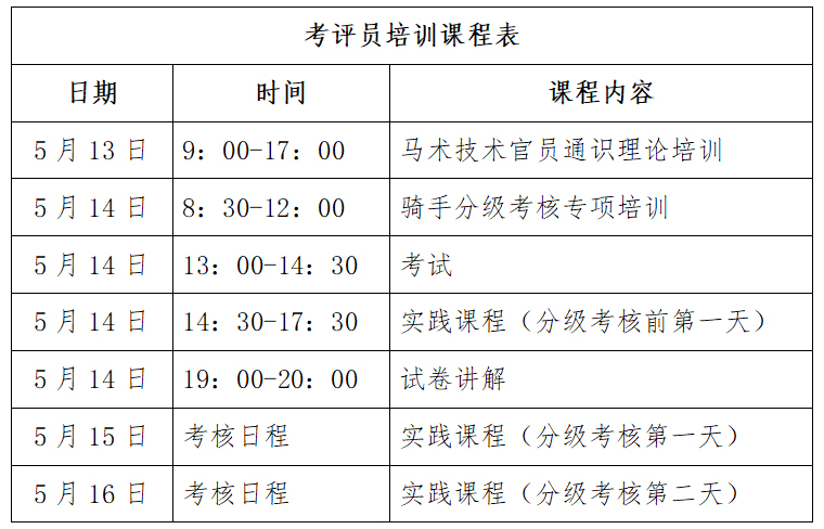 根據(jù)考評(píng)員培訓(xùn)計(jì)劃,我協(xié)會(huì)將于2021年5月13日-16日在北京市縱橫馬術(shù)學(xué)院(順義店)舉辦考評(píng)員培訓(xùn)活動(dòng),合格者授予相應(yīng)等級(jí)考評(píng)員證書。現(xiàn)就本次培訓(xùn)考核相關(guān)事宜通知如下: