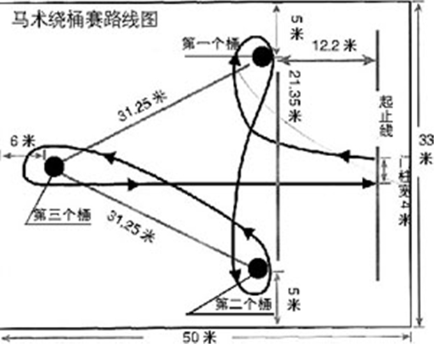 一、繞桶賽是使用三個(gè)相同的桶,按苜蓿葉形狀擺放的一個(gè)預(yù)定的比賽項(xiàng)目。在賽場(chǎng)內(nèi)分別按標(biāo)準(zhǔn)尺度、標(biāo)準(zhǔn)距離放置三個(gè)鐵桶為繞行標(biāo)志。