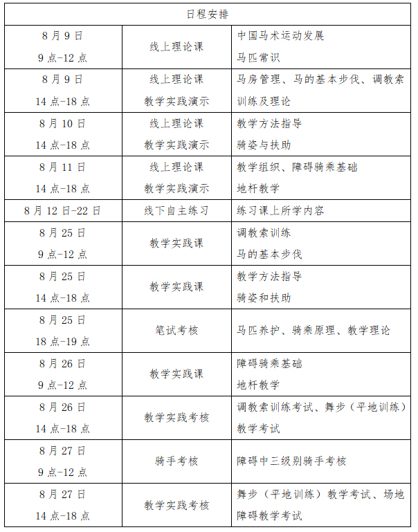 (三)線下輔導(dǎo)和實(shí)踐考核:2021年8月25日-8月27日,在長(zhǎng)泰半月山國(guó)際馬術(shù)俱樂(lè)部進(jìn)行線下集中輔導(dǎo)與實(shí)踐考核。