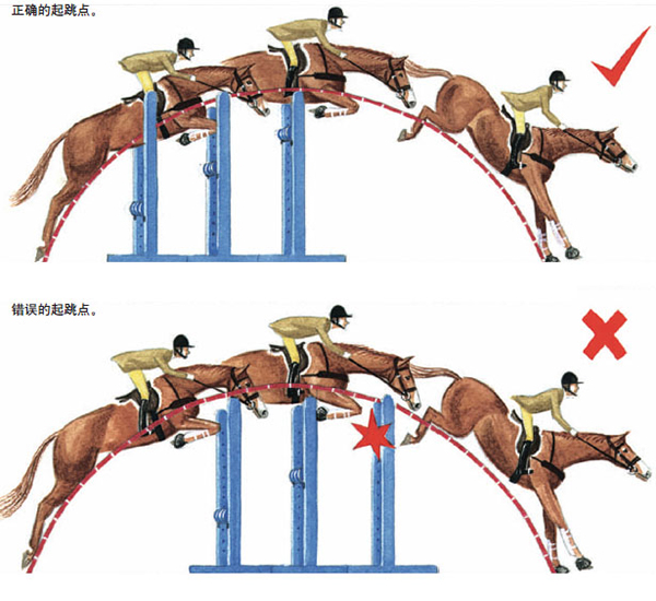 跳寬障礙時(shí),可能需要稍微地加快一些步伐,但是要小心不要把力量放在馬匹前肢上。如果馬匹沒有動(dòng)力,它跳寬障礙就會(huì)很困難,所以騎手在接近寬障礙時(shí)一定要給馬匹很強(qiáng)的動(dòng)力。當(dāng)跳越三橫木時(shí),應(yīng)以中間那根障礙桿為準(zhǔn),如果騎手看的是中間那根障礙,起跳點(diǎn)太遠(yuǎn)的機(jī)會(huì)就少一些,如果遠(yuǎn)跳了,馬匹就需要很大的拋物線去跳,那么它很可能會(huì)落在障礙中間,如果是這樣,馬匹今后再跳三橫木就會(huì)很擔(dān)心。