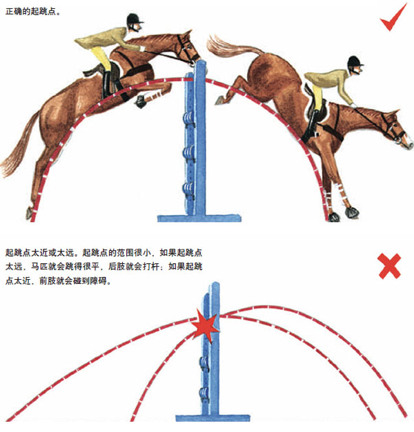 我們要記住馬匹是不喜歡打到障礙的,它們碰掉障礙通常都是騎手帶它們進(jìn)障礙進(jìn)得不好。重要的是,騎手們?cè)诮咏系K時(shí)不要為盡力讓馬干凈地越過(guò)障礙而緊張。不要試圖去拉馬起跳,這樣會(huì)令馬匹背部凹陷,沒(méi)有很好的拋物線,馬匹就一定會(huì)打桿。同樣的,在接近障礙時(shí)如果讓馬收縮得太多,會(huì)令馬失去節(jié)奏,也會(huì)跳越失敗。