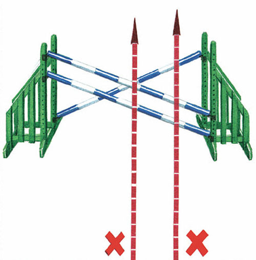 如果前面的那根桿右邊高一些,那么進(jìn)障礙時(shí),路線就應(yīng)選擇中間偏左,但是你還是要保持正直地進(jìn)入障礙。