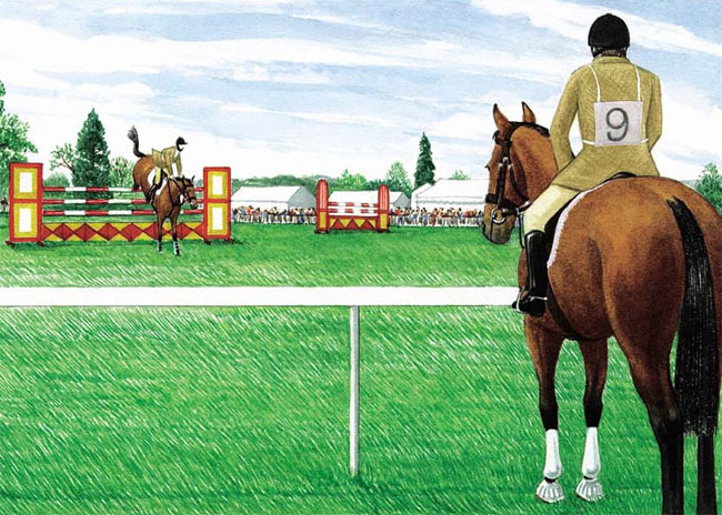 最初幾次比賽應(yīng)是小級別的障礙,讓它不會受到驚嚇。當(dāng)你進入場地障礙后,先圍繞場地轉(zhuǎn)一圈,但不要故意去做給它看。讓馬匹在關(guān)系障礙之間快步,或者從那些具有夸張?zhí)畛湮锏恼系K前經(jīng)過,然后再開始你的比賽。請記住,你在教你的馬匹,必須讓它學(xué)會,而且要盡最大的可能保持很好的節(jié)奏。