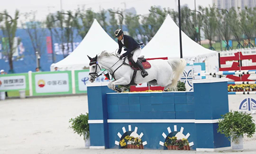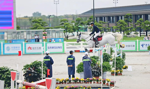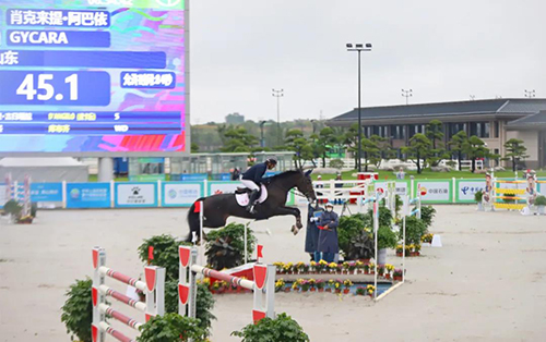 下午的比賽繼續(xù)在雨中進(jìn)行。第二輪比賽共設(shè)11道障礙、14跳,梁銳基與愛馬以8個罰分、76.01秒的成績完成比賽,并以兩輪8個總罰分無懸念地拿下了場地障礙個人賽金牌。兩輪比賽結(jié)束后,同以12個罰分完賽的浙江隊騎手徐昊、段義華放棄附加賽的繼續(xù)爭奪,最終段義華與“幕蓿(Mu Xu)”組合、徐昊與“Eyes Blue De La sina”組合分享了亞軍和季軍。